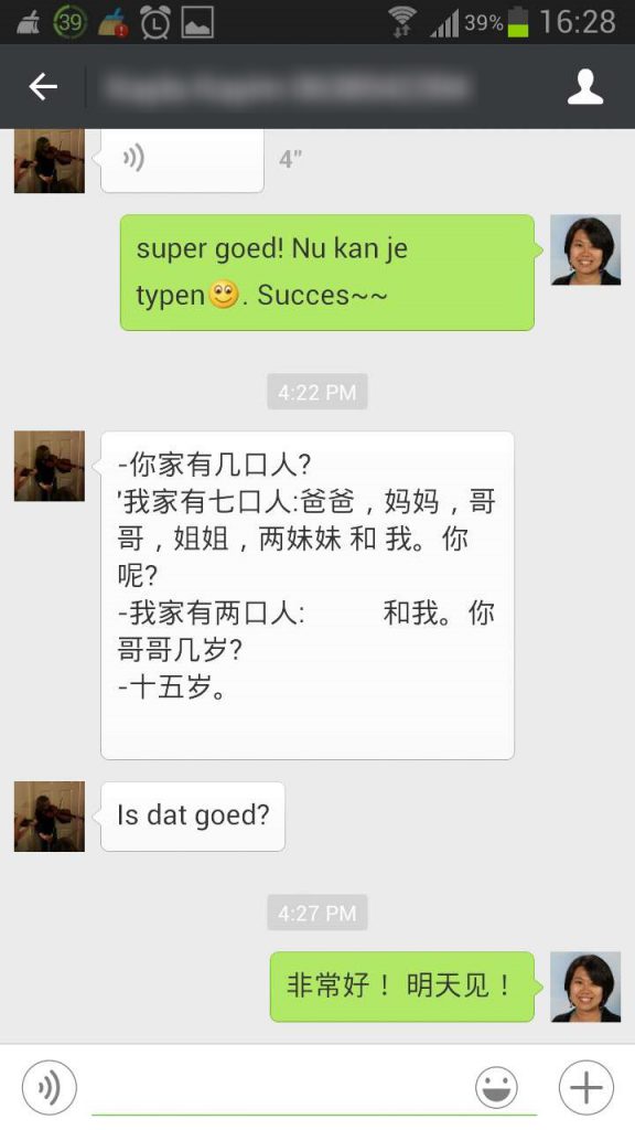 Jessica gebruikt ook de populaire Chinese chat-app WeChat voor haar lessen. “Ik gebruik het onder andere voor een uitwisseling tussen culturen. In een soort moderne vorm van de ouderwetse penvriend leggen de leerlingen contact met leerlingen uit China. Ze leren zo hoe een dag van een Chinese tiener eruit ziet, wat hun relatie met hun ouders is, etc. Allemaal nieuwe aspecten waar ze heel erg nieuwsgierig naar zijn. Daarnaast geeft het hen een idee hoe Chinese technologie werkt.”