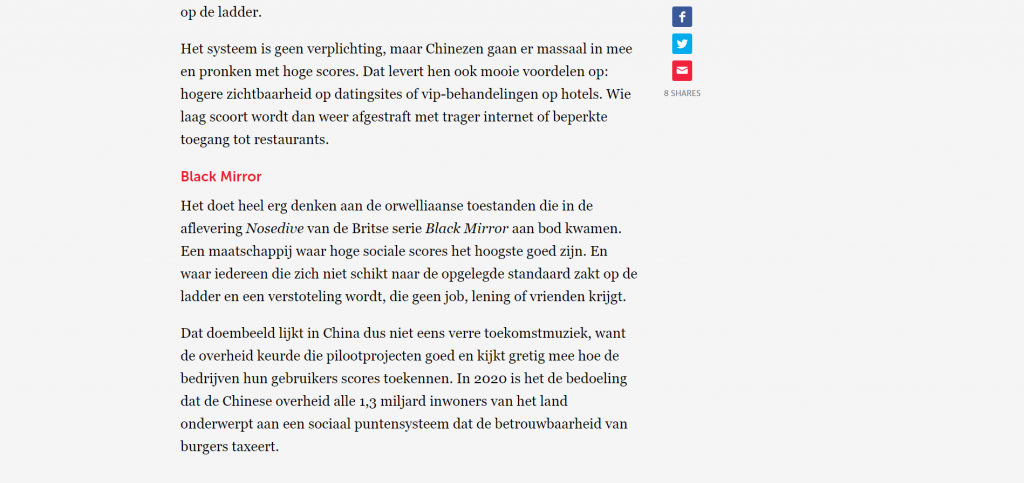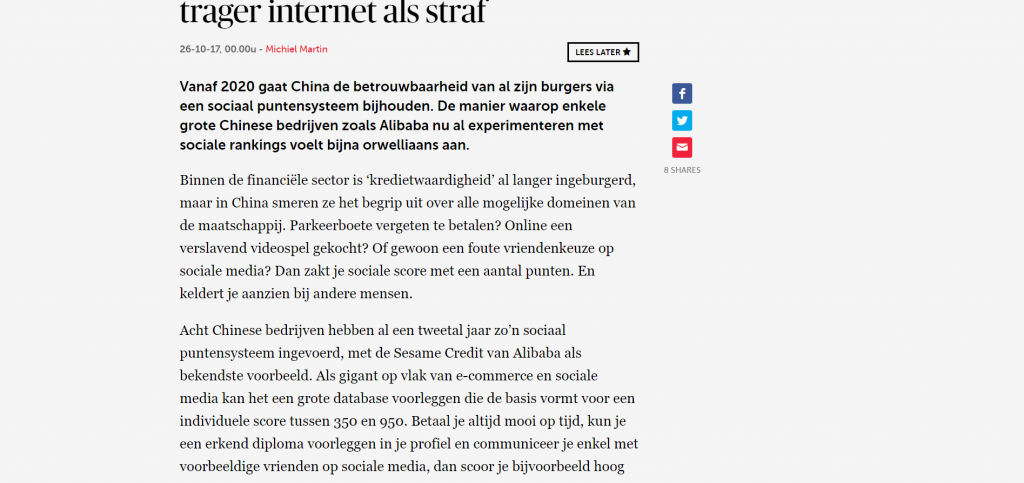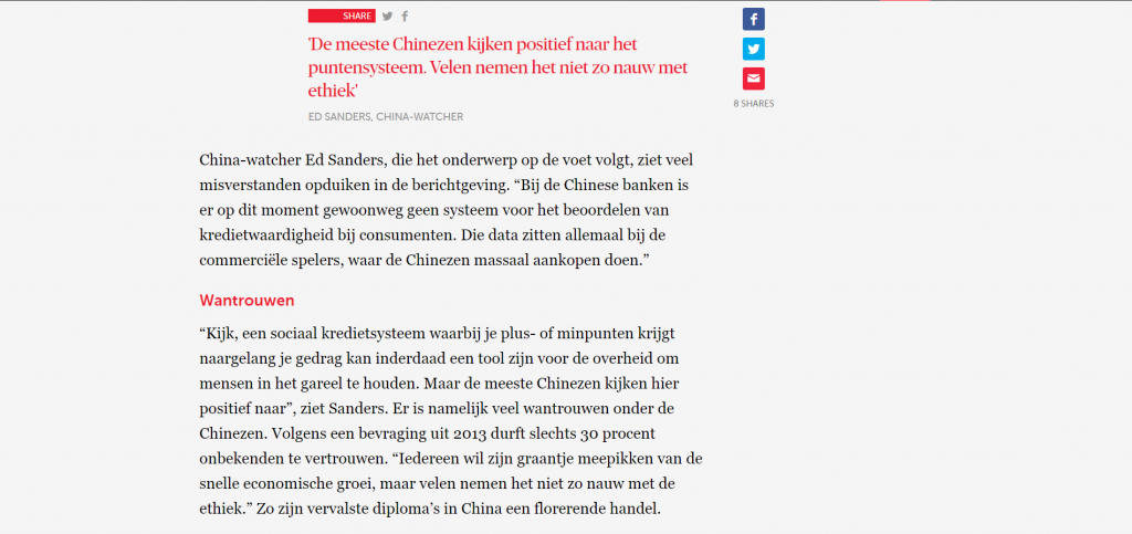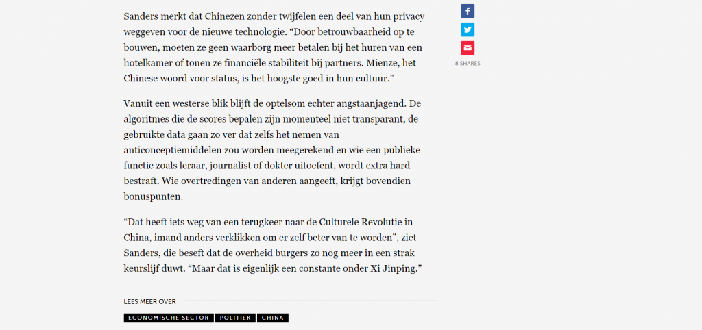Ik legde uit dat veel burgers het idee van een sociaal kredietsysteem, waarin ze kunnen zien hoe betrouwbaar iemand is, toejuichen en dat de angst om hun privacy niet zo leeft in het land. Chinezen leveren graag wat privacy op als dat duidelijke voordelen oplevert, kijk alleen maar naar de apps van Alibaba en Tencent. Problematischer is dat de overheid het sociaal kredietsysteem natuurlijk ook gaat gebruiken als middel om het volk in het gareel te houden. Ook vertelde ik over de klikcultuur die een rol lijkt te gaan spelen in het sociaal kredietsysteem.