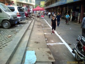 Op weg naar m’n werk loop ik langs de zuidelijke ingang van het dorp. Deze morgen was er iets merkwaardigs aan de hand. Een bestelwagen met een luidspreker stond bij de ingang geparkeerd en er werd een aankondiging gedaan. Een plastic opblaasboog, die je vaak aantreft bij de opening van een nieuwe winkel op restaurant, was voor de ingang geplaatst en in de hele straat waren banieren opgehangen met Chinese teksten. Er was politie aanwezig en een opmerkelijk aantal mannen in grijze uniforms met hun baret op hun schouders geknoopt. Ik had geen idee wat er aan de hand was. Ik had wel gemerkt dat een paar weken eerder alle voedselstalletjes verdwenen waren, maar dat gebeurde wel vaker als de lokale overheid om een of andere reden een opschoonactie hield. Meestal keerde alles na een paar dagen wel weer terug. Maar deze keer niet..